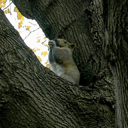 Look at those chunky arms and big belly! I love how the squirrels get so chubby at this time of year. Their coats get so glossy, stretched over their big bellys, they seem like totally different squirrels than the ones running around in the spring. But this squirrel, well, he was even big for a late autumn squirrel. He also had a short stubby tail, which made him seem even fatter. I had to chase him all over to get this picture, and it doesn't even show off his winter fat as well as some of his poses, but it was the best I could capture! Picture Taken November 15, 2004 by RCH |