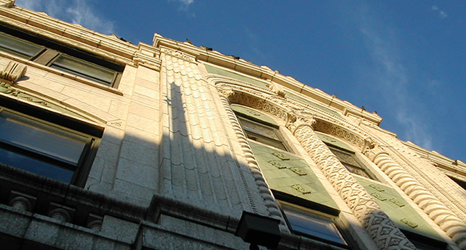 This wonderful old building is on the corner of Wilson and Clark, right on the edge of the Uptown neighborhood in Chicago. Although it often looks like it is falling into disrepair, early morning moments like this one give a glimpse of its former glory. There are many more anonymous (and not so anonymous) buildings with fabulous terra cotta facades dotting Chicago's streets. Picture Taken October 25, 2004 by RCH |